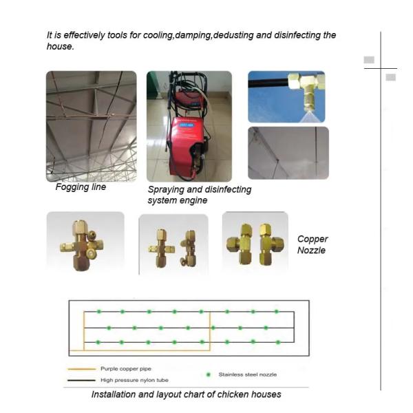 * Sprayed water fog can purigy the dust in air during the descending.At same time,water soluble disinfection drugs can be added into the spray to achieve the effect of the disinfection with chickens.